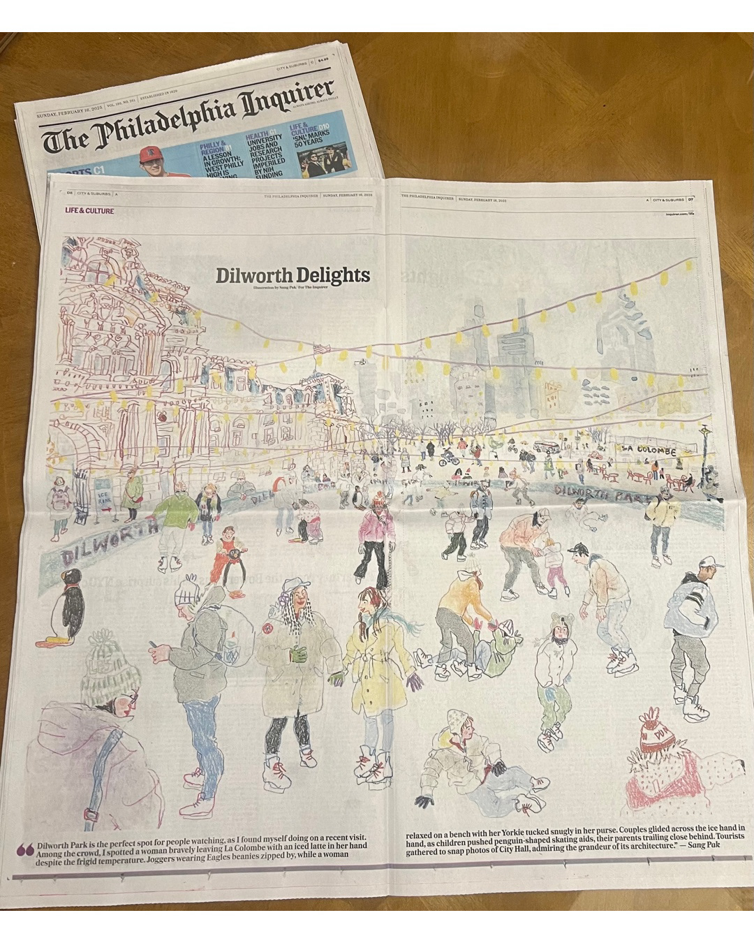 An illustration (19 in x 21 in) of ice skaters at Dilworth Park in Philadelphia for the Inquirer's Life & Culture section on their Sunday paper. Also wrote a short paragraph about my observations at the park.